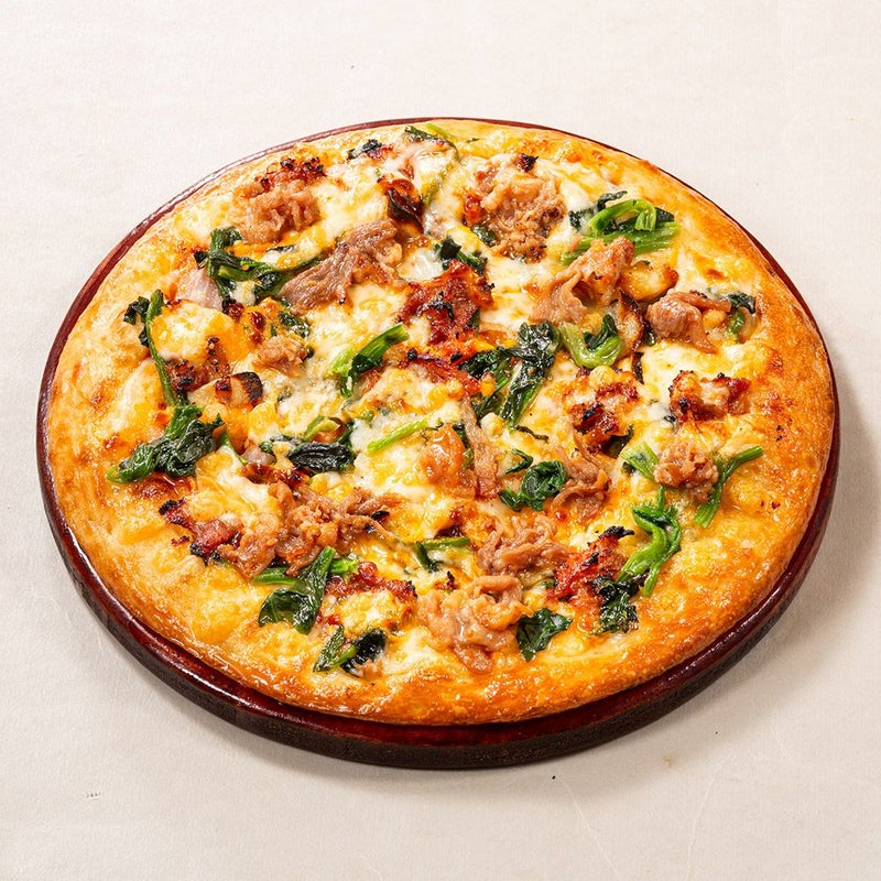 | 商品詳細 | オリジナルのトマトソースに養豚県千葉のブランドポーク「房総マーガレットポーク」を使用したテジプルコギ、オニオン、ピーマン、ほうれん草、青森産にんにく、チェダーチーズソース、オリジナルチーズをトッピング。ガツン!と美味しい焼肉ピザ♪ |