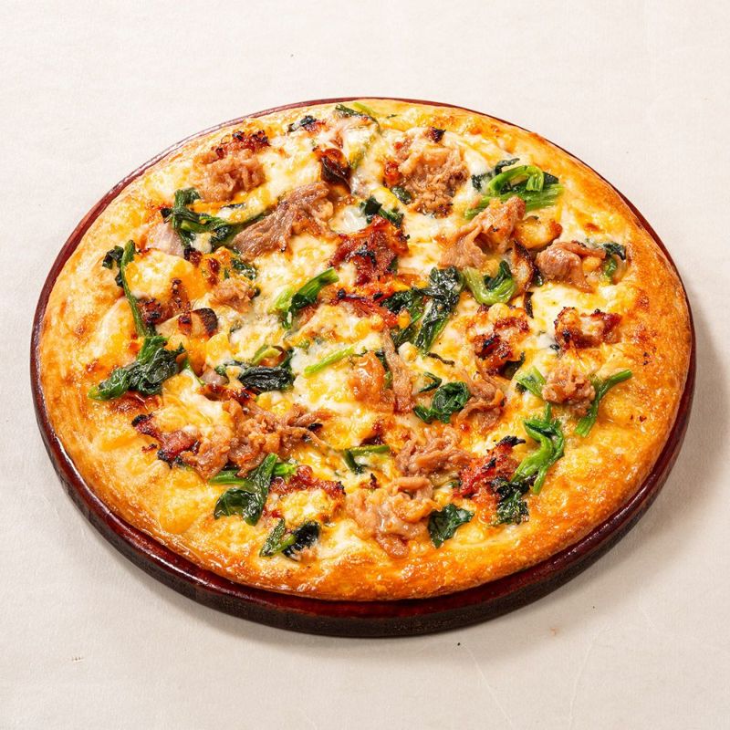 商品詳細 | オリジナルのトマトソースに養豚県千葉のブランドポーク「房総マーガレットポーク」を使用したテジプルコギ、オニオン、ピーマン、ほうれん草、青森産にんにく、チェダーチーズソース、オリジナルチーズをトッピング。ガツン!と美味しい焼肉ピザ♪ |